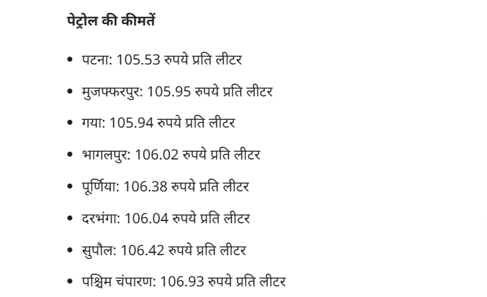 दोस्तों शनिवार 28 दिसंबर 2024 के लिए पेट्रोल डीजल का भाव जारी कर दिया गया है. जोकि हर दिन सुबह 6 बजे नई कीमत जारी हो जाती है. बिहार के लिए पेट्रोल-डीजल की नई कीमतें जारी हो गई है. वही दिल्ली और मुंबई जैसे शहरों में इसकी कीमत में कोई बदलाव नही हुआ है.